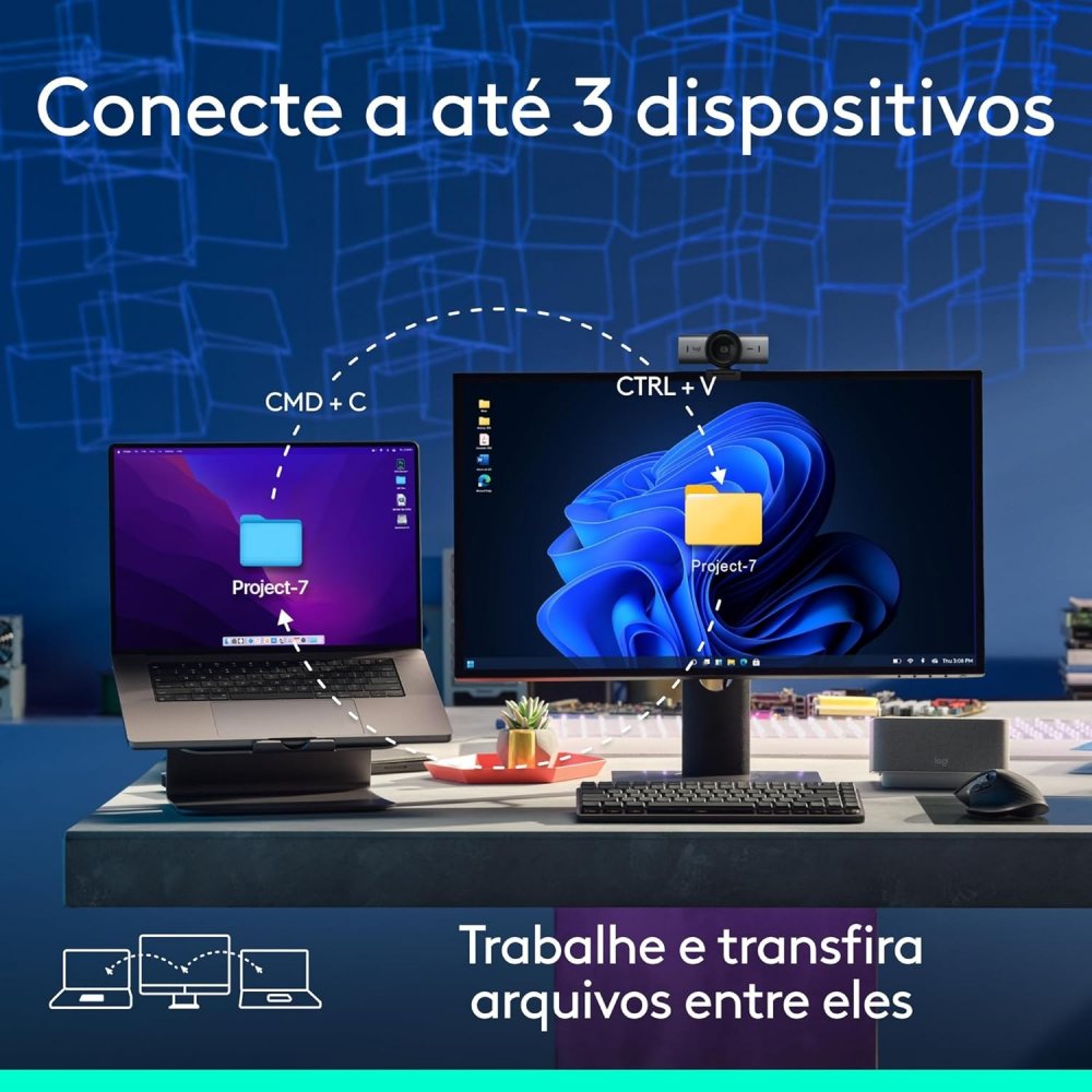 Vale destacar que, através do aplicativo Logi Options+, você ativa o controle entre computadores via tecnologia Flow, permitindo transferir arquivos e textos entre diferentes sistemas operacionais com facilidade. A conexão é realizada via Bluetooth, sendo também compatível com o receptor Logi Bolt, proporcionando versatilidade total para o seu setup profissional.