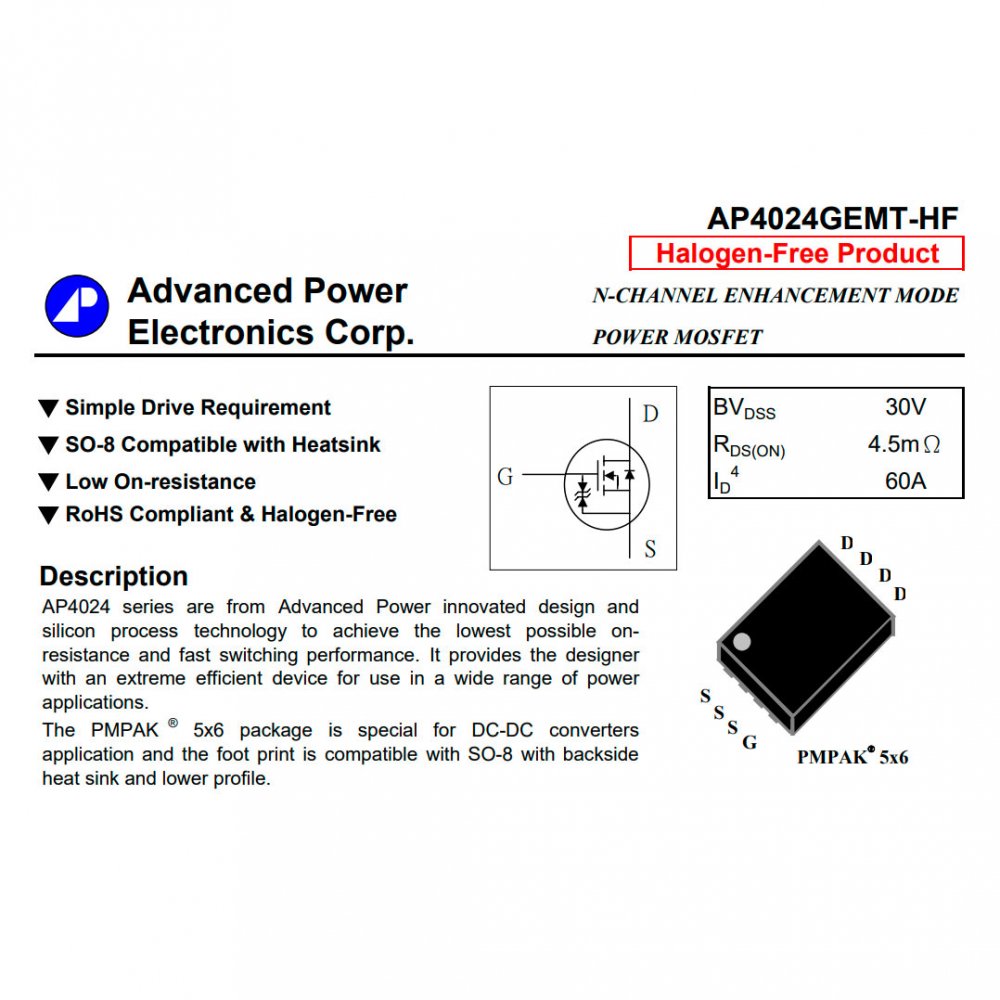 AP4024E Power Mosfet N-Channel 30V 60A RDSon 4.5mOhm