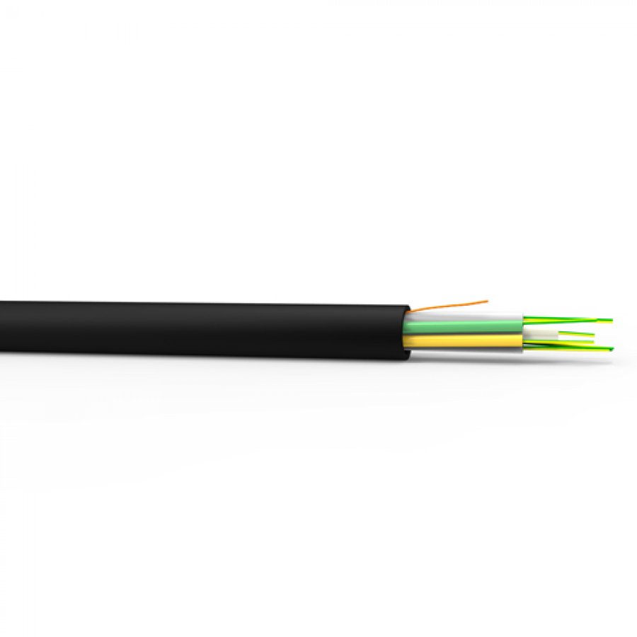Construção Feito de tubos loose reunidos ao redor de um elemento central rígido (FRP), reforçados com fios de fibra de vidro como reforço para tração, e uma capa externa retardante a chama.