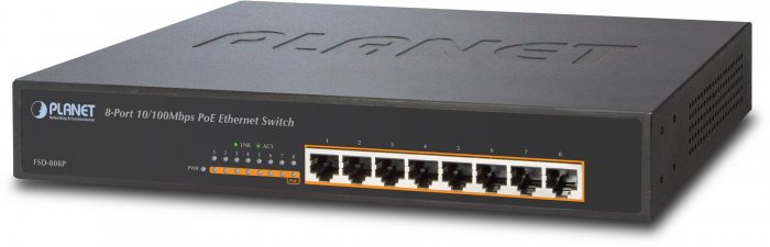 Para atender à demanda de potência PoE suficiente para aplicações de rede Fast Ethernet, PLANET introduz um novo membro na família Switch 802.3af PoE -. FSD-808P, o 8-Port 10/100Mbps 802.3af PoE Switch O FSD-808P suporta 125 Watts PoE orçamento e 8-Port poder 802.3af PoE injector função de conduzir 8 IEEE 802.3af dispositivos alimentados. O FSD-808P também fornece um simples, custo-efetivo, e desempenho non-blocking wire-speed com 12 polegadas forma de metal para implantação de desktop em caixa compacta, aplicações SOHO escritório ou departamento da rede.