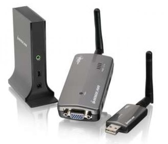 | Specifications | Antenna Type Omni directional Video Resolution Up to UXGA 1600x1200 or WSXGA+ 1680x1050 Video Streaming Up to 720p Color Depth 32-bit true color Interface Audio: 3.5mm TRS audio connector ; Video: VGA female connector Frequency Band 3.1GHz ~ 4.8GHz (WiMedia Band Group 1) Number of Channel 7 Channels (3 FFI + 4 TFI) Operating Range Up to 30 feet (10 meters) Operating System Support Microsoft XP 32-bit; Vista 32/64-bit PHY Data Rate 53.3Mbps, 80Mbps, 106.6Mbps, 160Mbps, 200Mbps, 320Mbps, 400Mbps, 480Mbps RF Modulation Type QPSK/DCM Security Highly secured wireless connection (AES 128-bit) USB Specification Certified Wireless USB 1.0; Certified USB 2.0 Power Supply Audio Adapter: 5V, 1Ah, 100-240VAC; Video Adapter: 5V, 2Ah; 100-240VAC |