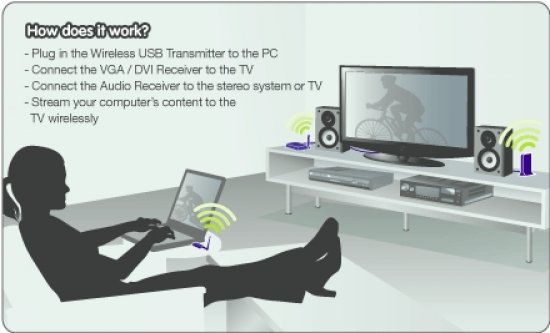 | Features | Eliminate Cable Clutter – Connect your computer to your TV wirelessly without the long and unattractive cable run Wireless Audio – Wirelessly distribute audio content from your PC to any stereo system with 3.5mm TRS stereo audio connector Wireless HD Video – Up to 720p video streaming; Support resolutions up to 1600 x 1200 or 1680 x 1050 Ultra-Fast – Strong and reliable wireless signals, ideal for streaming media content across the room up to 30 feet away Easy & Secure – No complicated network setup or wireless interferences Certified Wireless USB – Seamlessly work with other Certified Wireless USB products |