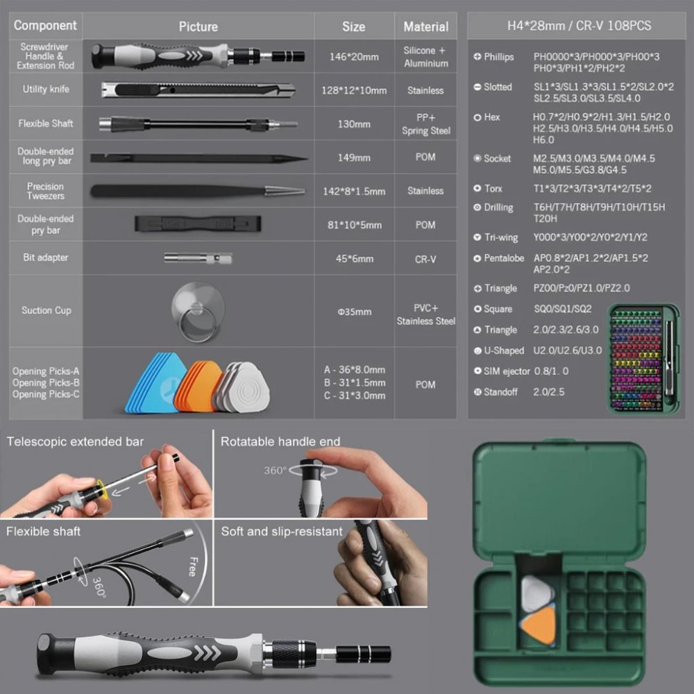 KA-7066 Kit manutenção jogo de chaves de precisão 132 em 1 com ventosa, espátula, pinça e alongador flexível