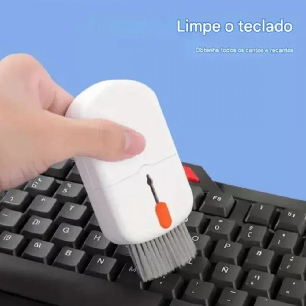 - Escova retrátil para remover sujeiras entre as teclas.