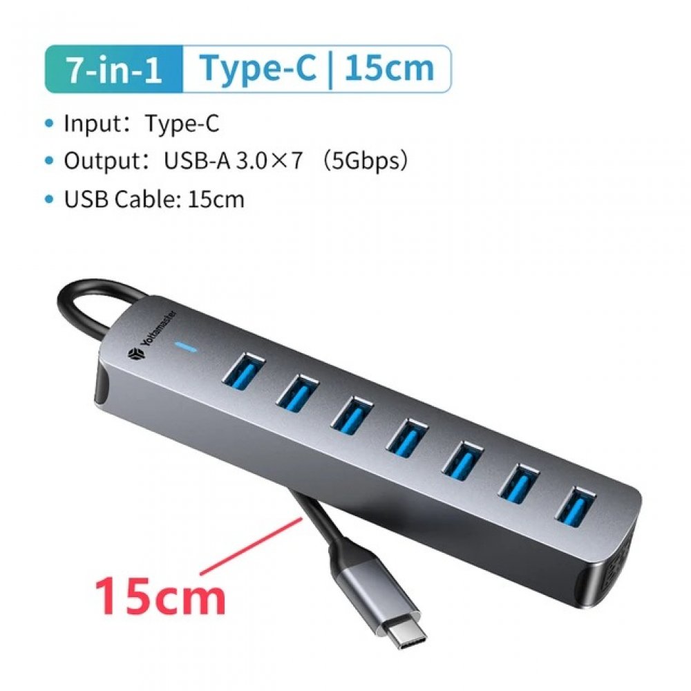 PH7U-C3-015-GY Yottamaster HUB USB-C para 7 USB 3.0 5Gbps Cabo 15cm com entrada de alimentação Tipo-C 5V 3A Compatível com Windows/MAC OS/Linux