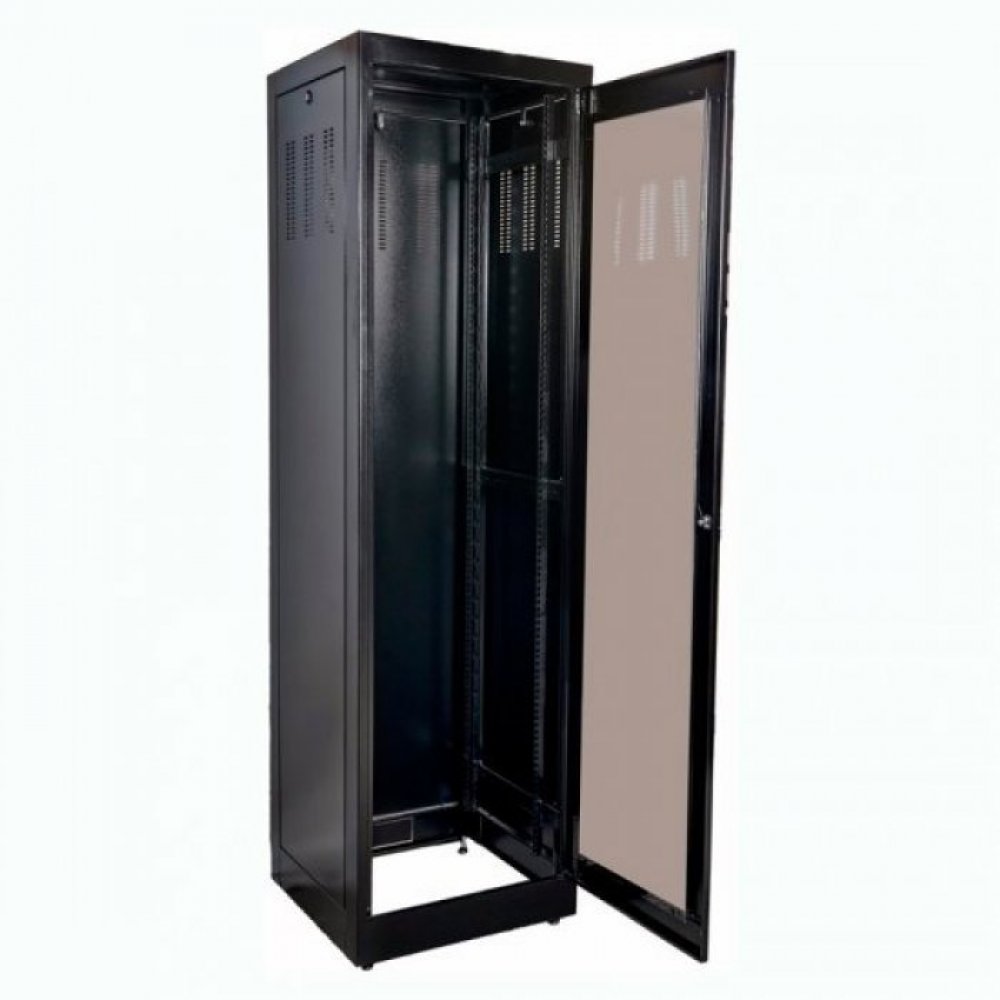 R03011944087500 Raker rack piso 44U 875mm preto padrao 19 Porta frontal com visor de acrílico fumê 2mm. Laterais e fundo removíveis com fecho rápido tipo fen