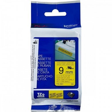TZES621 Brother Fita Extra Forte 9mm 8m Preto Amarelo Fita laminada super adesiva, texto preto sobre fundo amarelo