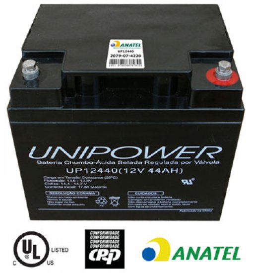 - Bateria de chumbo-acido Unipower UP12440, com tensão de 12 V e corrente de 44 Ah.