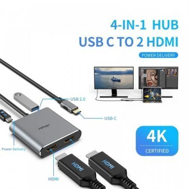 USBC-2XHDMI-4IN1 Hub USB-C para 2x HDMI 4K, USB 2.0 e PD 100W