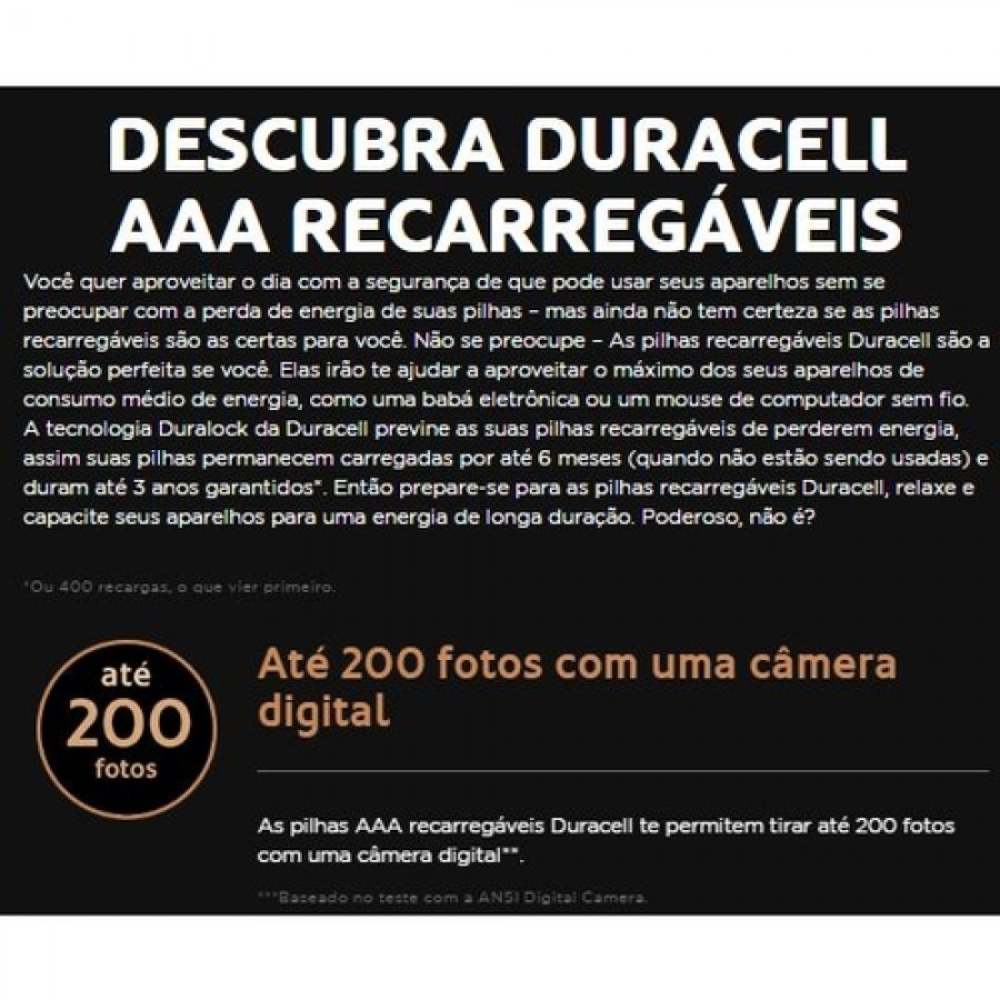 Tags de AAA850MAH-1.2V-4: AAA850mah-1.2V-4, Pilha Recarregável Duracell A A A 850mAh 1.2v - Pacote Com 4, pilha recarregavel duracell, pilha aaa duracell, pilha recarregável duracell AAA, pilha 3A, pilha duracell 850mah, pilha com sistema Duralock, DURACELL