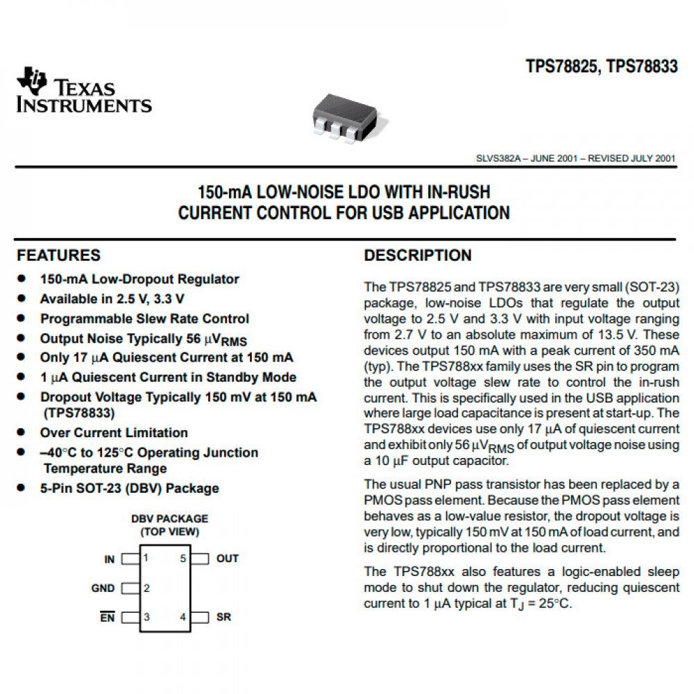Tags de TPS78833DBVR: TPS76033DBVR, TPS788, TPS78833DBVR, TPS78833, TPS78833D, TPS78833DB, 78833, regulador 3,3v, regulador 3.3v, low-dropout voltage regulator with enable, regulador de tensao 3,3v, regulador linear 3.3v, Texas Instruments